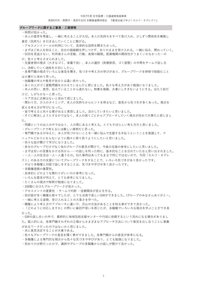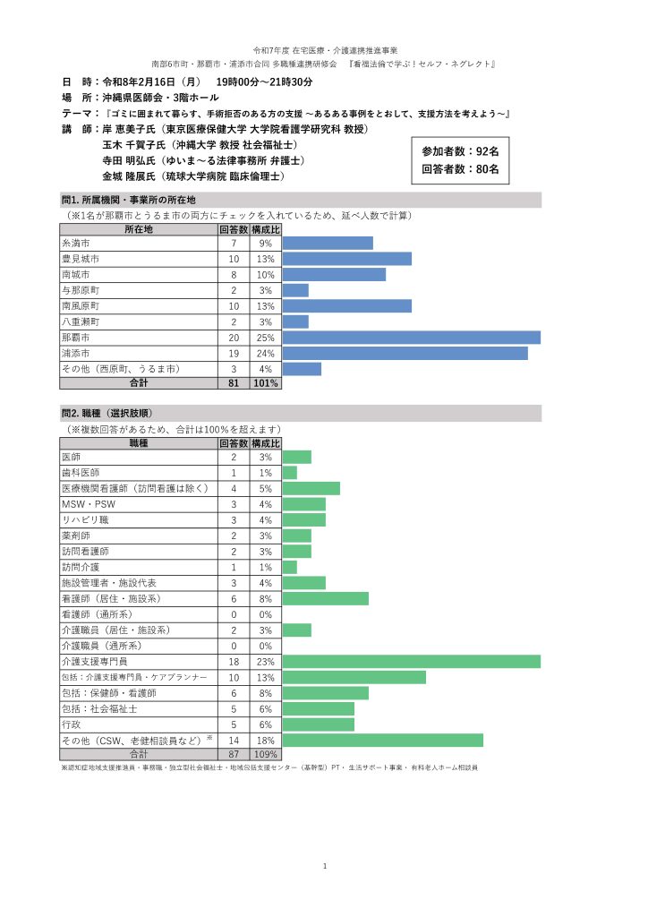 【テーマ】 『看福法倫で学ぶ!セルフ・ネグレクト』 「ゴミに囲まれて暮らす、手術拒否のある方の支援」~あるある事例をとおして、支援方法を考えよう~ 【講師】 岸 恵美子 先生(東京医療保健大学 東が丘看護部/ 大学院看護学研究科 教授) 玉木 千賀子 先生(沖縄大学 人文学部 福祉文化学科 教授/ 社会福祉士) 寺田 明弘 先生 (ゆいま~る法律事務所/ 弁護士) 金城 隆展 先生(琉球大学病院 地域・国際医療部/ 臨床倫理士) |